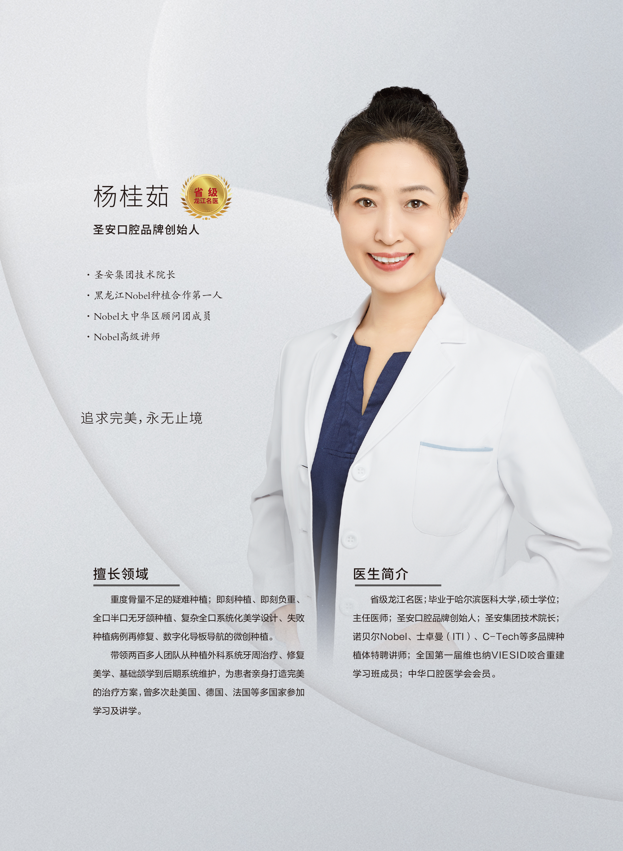 圣安口腔的創(chuàng)始人楊桂茹院長(zhǎng),省級(jí)龍江名醫(yī),畢業(yè)于哈爾濱醫(yī)科大學(xué),碩士學(xué)位;諾貝爾Nobel、士卓曼、C-Tech等多品牌種植體特聘講師;楊院長(zhǎng)熱愛(ài)口腔醫(yī)療這份事業(yè),發(fā)自心底的想把這件事做好。目前,哈爾濱圣安口腔擁有四家分院,近300名員工,推行全科加??频尼t(yī)療體系,各診室配備牙周、口外、口內(nèi)等多學(xué)科口腔醫(yī)師,個(gè)性審美技師,口腔護(hù)師協(xié)同配合、多學(xué)科協(xié)作系統(tǒng)診療,并率先引進(jìn)迪凱爾數(shù)字化動(dòng)態(tài)導(dǎo)航、豪孚迪器械、3 shape口內(nèi)掃描儀、Zumax手術(shù)顯微鏡、阿曼吉爾巴赫掃描儀等全套設(shè)備,用心服務(wù)患者。