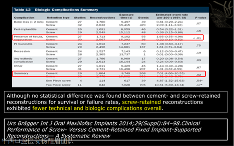 2. 對于螺絲固位與粘結(jié)固位修復方式這兩種修復方式,在植體的存活率或者失敗率,并沒有發(fā)現(xiàn)特別的不同。但螺絲固位方式下的再修復展現(xiàn)出更少的技術(shù)或生物并發(fā)癥